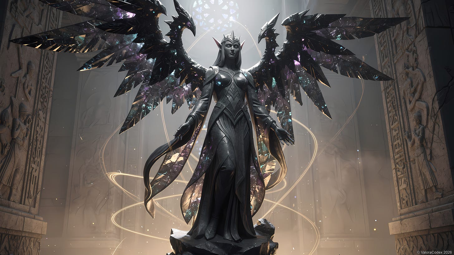 These statues are not merely commemorative; they are active metaphysical nodes. In times of extreme Void corruption, the obsidian wings of the martyrs are said to resonate, emitting a “low-frequency hum” that strengthens the Bound Sky. Although High Matriarch Ahora Val’thera is the only living elf with these wings, the Liturgy of the Obsidian Pulse suggests that many “hidden Astral Kindred” reside within the statues themselves, awaiting the call of the World-Chord to reactivate their aetheric strikes.